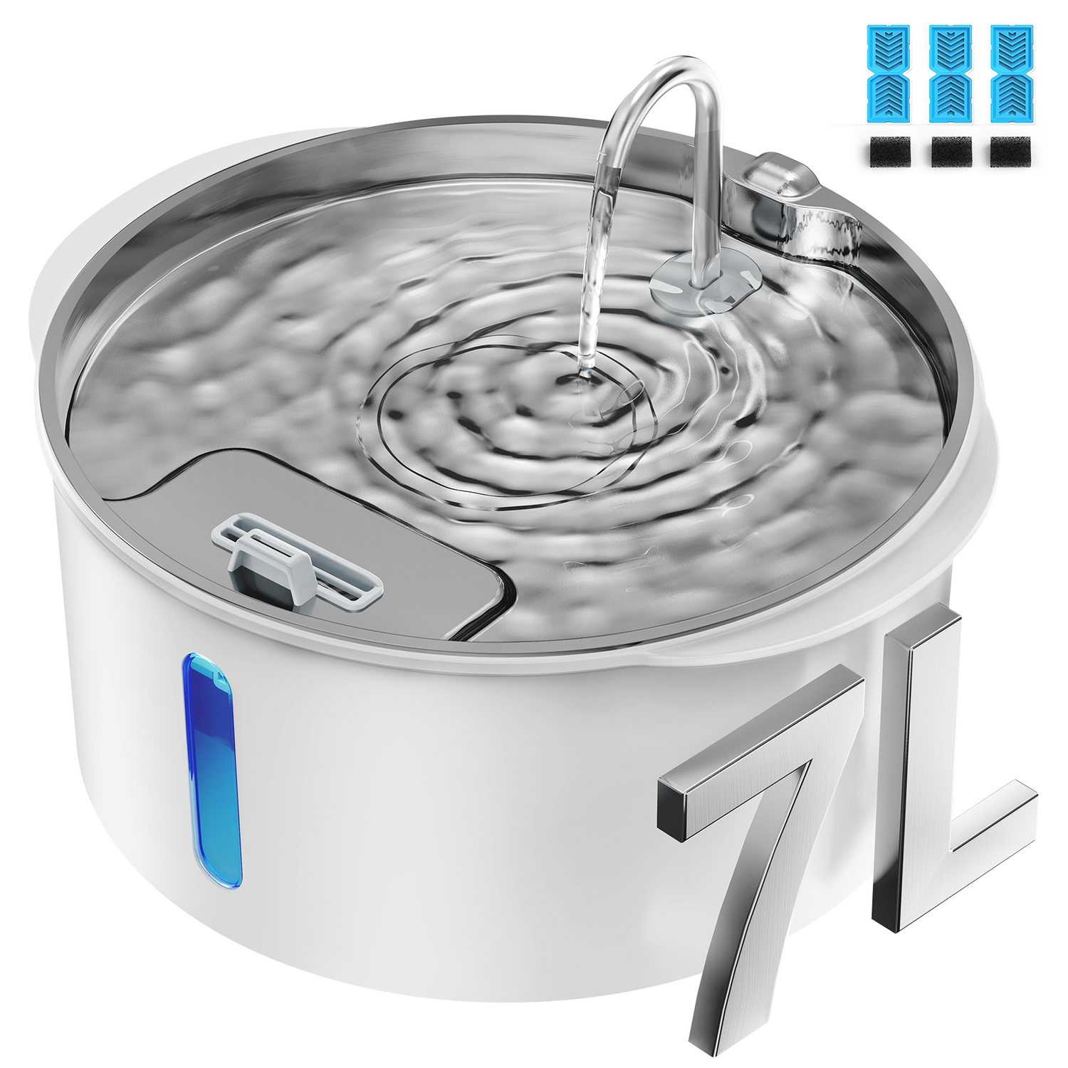 Pektaco Dog Water Fountain for Large Dogs, 1.8Gal/7L Pet Water Fountain, Dog Water Bowl Dispenser with Viewing Window & LED, Super Quiet, Stainless Steel Tray Easy Clean BPA-Free(with 3 Filters)