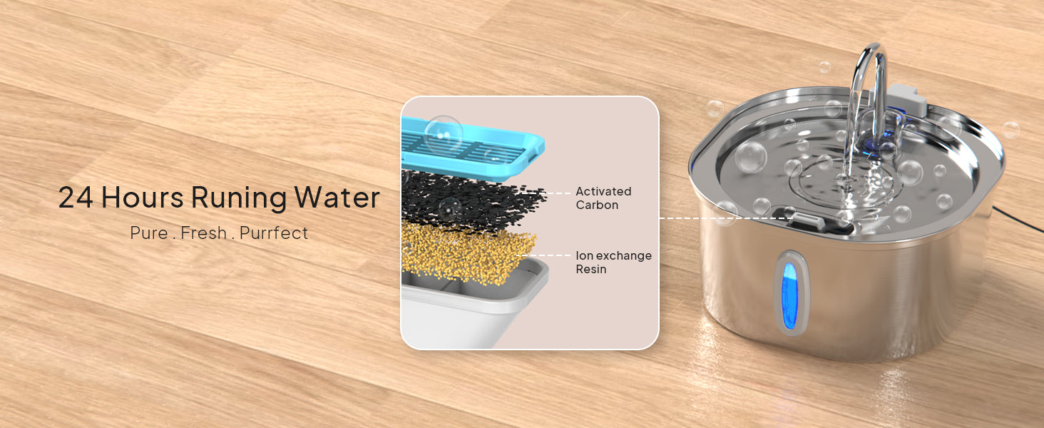 - Double Filtration System: Utilizing pre-sponge filtration, along with activated carbon and ionic resin, the automati cat dog water fountain creates a flawless water circulation process that ensures your pet's water is always pure and fresh