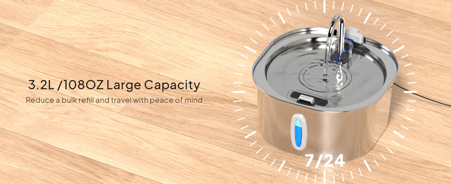 - Large Capacity: The water tank boasts an ample water capacity(3.2L), minimizing the need for frequent refills. This feature is particularly beneficial for households with multiple pets or for those who are often away from home