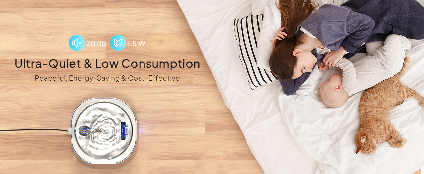 - Super Quiet: Engineered with an 15W pump, this pet water fountain operates at a noise level below 25db, providing a serene drinking experience for your pet. Say goodbye to noisy distractions, allowing your cat to drink and relax without any disturbances