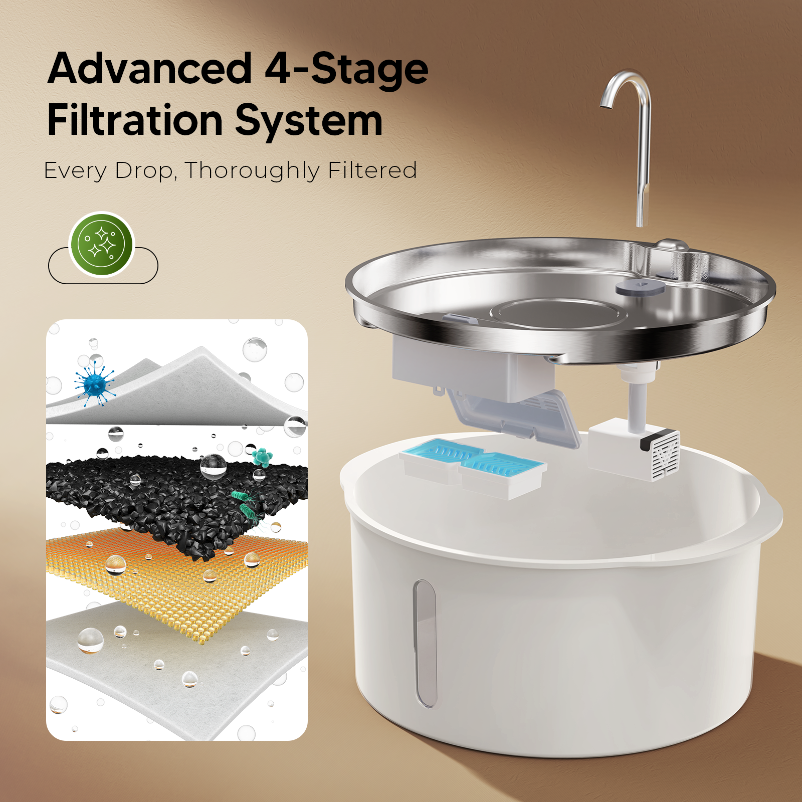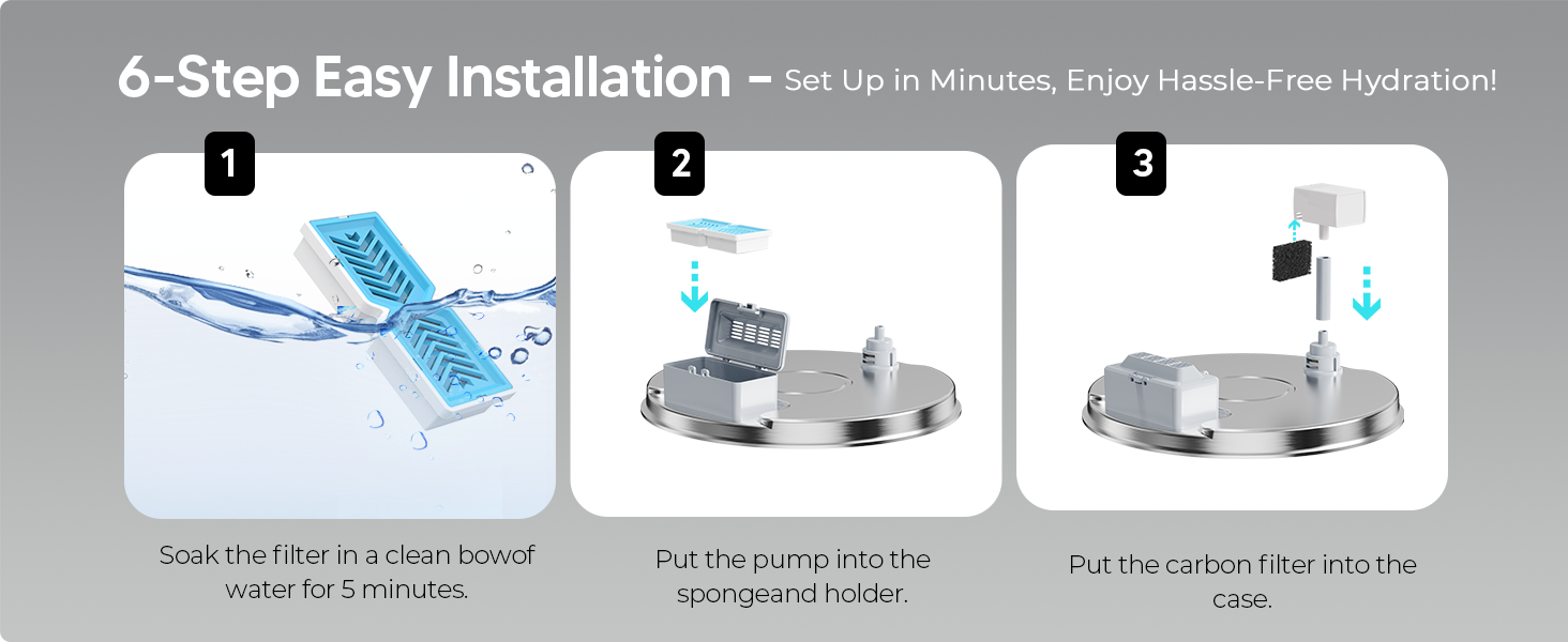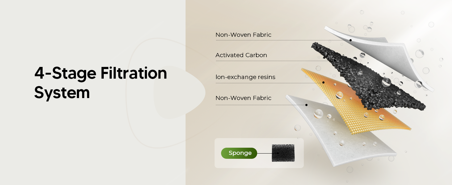 4-Layer Filtration System: This pet water fountain uses a four-stage filtration system to keep drinking water clean and fresh. The non-woven fabric catches pet hair and debris; the activated carbon removes odors and impurities; the ion exchange resin softens water and reduces heavy metals; and the sponge filter prevents pump clogging, extending its lifespan.