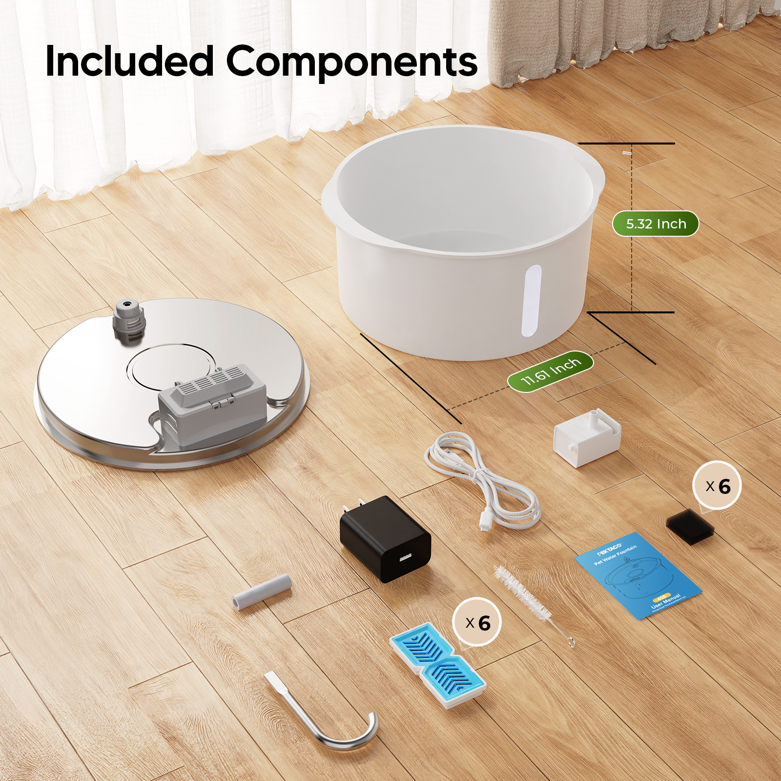 Stainless Steel Drinking Tray: The fountain includes a stainless steel drinking tray paired with a durable plastic reservoir. Constructed from high-quality materials, the tray is robust, resistant to damage, and capable of withstanding high-temperature sterilization. This enhances hygiene and supports better pet health by reducing the risk of illness associated with poor water quality.