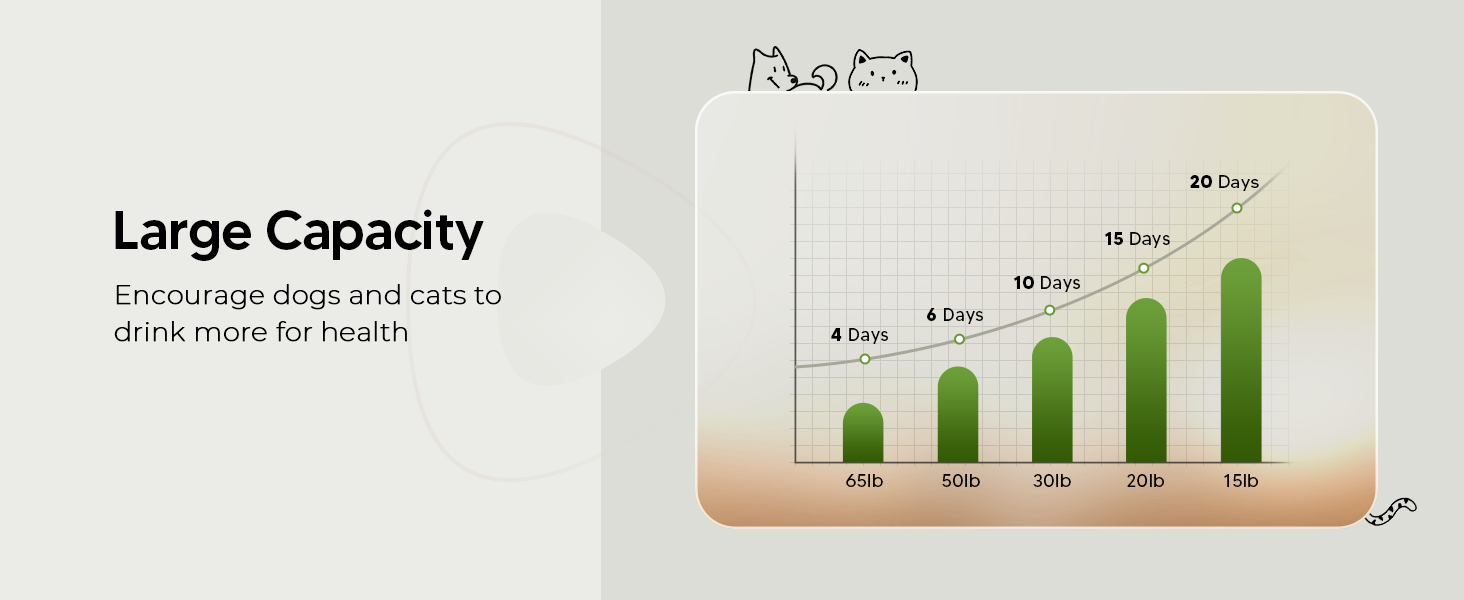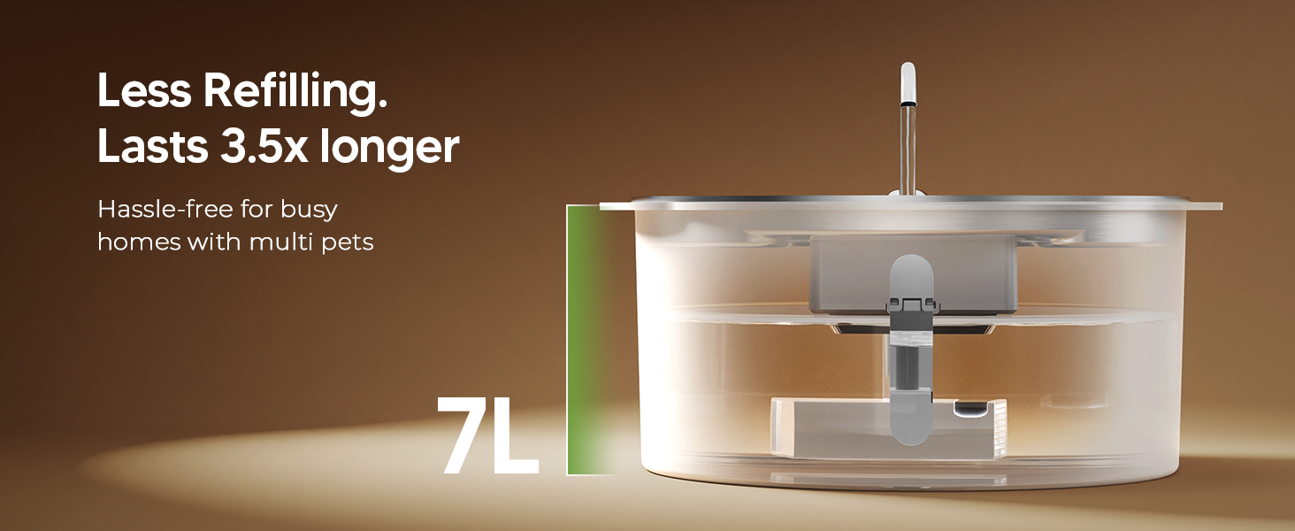 Extra-Large 1.8-Gallon Tank with Water Level Indicator: With an extra-large 236oz (7L) water capacity, this fountain meets the hydration needs of medium to large dogs or multiple pets for up to a week—no more constant refilling! Plus, the built-in water level window and LED light let you check the water supply at a glance, without removing the lid.