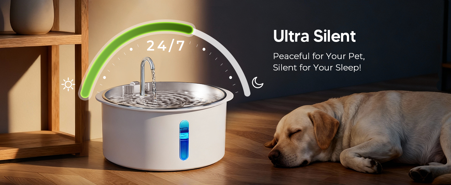 5V Ultra-Quiet Pump: The pet fountain features a advanced 5V low-voltage pump for near-silent operation (25 dB), preventing noise-related stress for pets. Its energy-efficient design ensures low power consumption for continuous use.