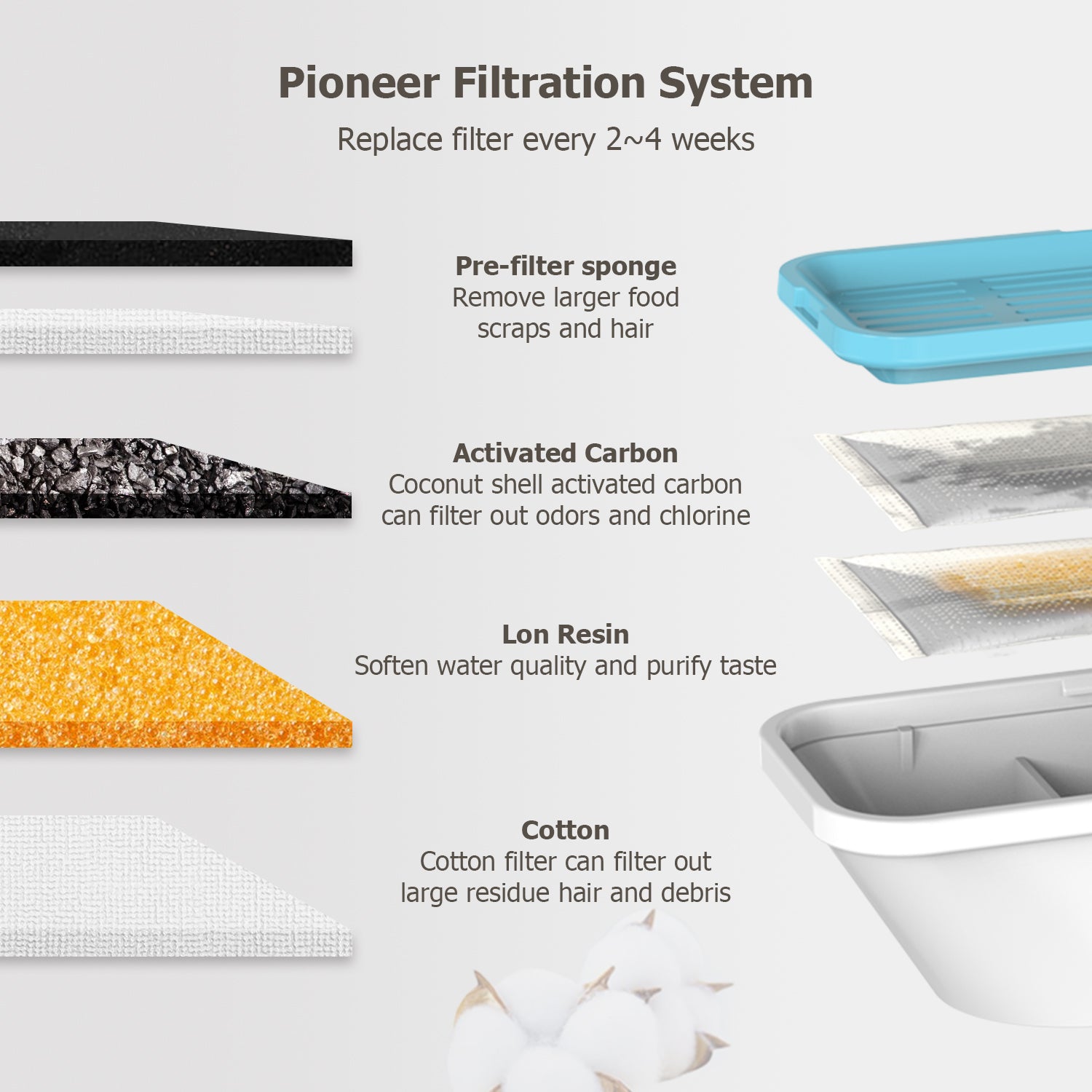 - 【Pioneer filtration system】 Utilizing pre-sponge filtration, along with activated carbon and ionic resin, our system creates a flawless water circulation process that ensures your pet's water is always pure and free of harmful impurities.