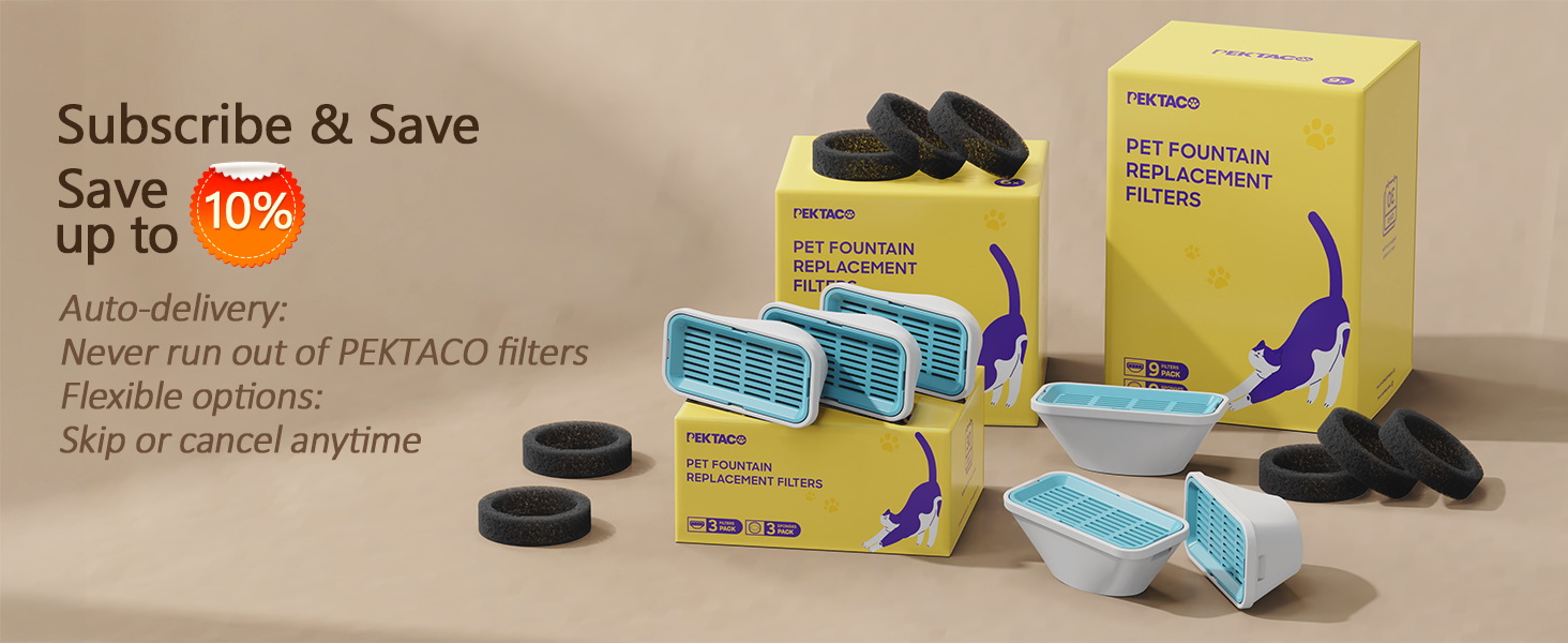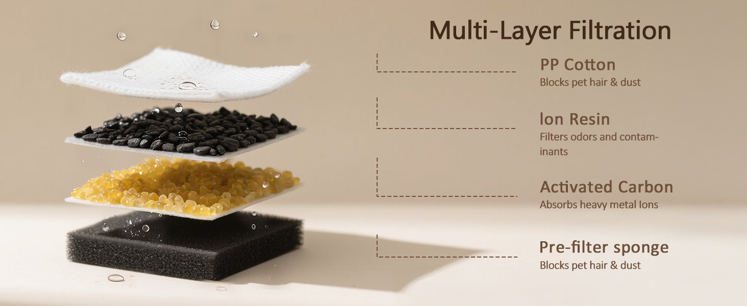 - 【Pioneer Filtration System】The cat fountain filter is a multi-layered filtration system consisting of activated carbon, ion exchange resin, and non-woven fabric. It effectively removes hair, heavy metals, dirt, and other impurities, ensuring that the water in the cat fountain remains fresh and clean at all times. This promotes healthy hydration habits in pets, encouraging them to drink more water and reducing the risk of urinary tract infections.
